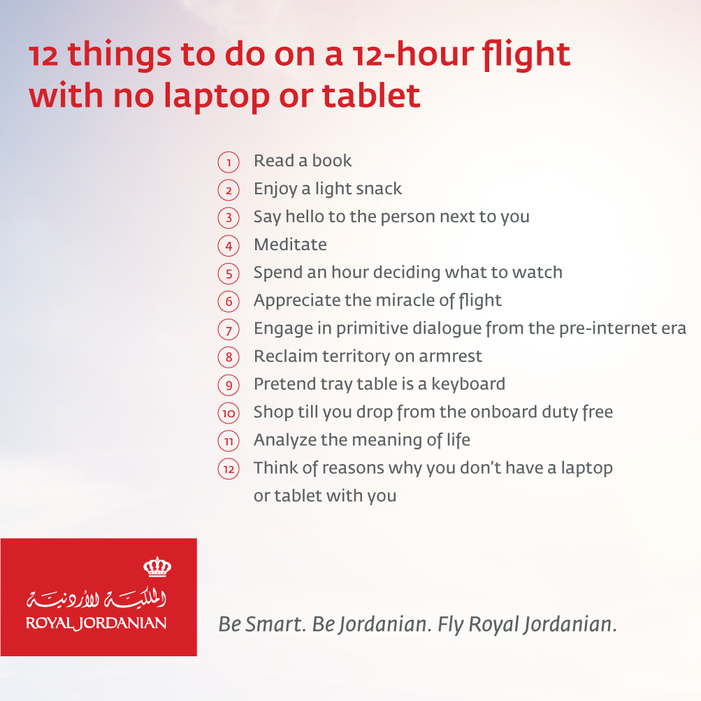 Recently Royal Jordanian Airlines made a fun list of 12 things to do on a 12 hour flight with no laptop or tablet, to slight the trending #electronicsban. Labee (Labeeb Ibrahim) and I started commenting underneath the original post just for (more) fun and ended up turning it into 100 things you could do (and sometimes get frowned at) while travelling on a flight. Safwat Ahsan (53-54**) and Ambilittha(Ambili Nuzarath) (55-61*) pooled in with their fun bits as well. So we thought, why not share the full list on our respective blogs? So here it is. “Fasten your seat belts (not really *wink*), sit back, relax and enjoy.”